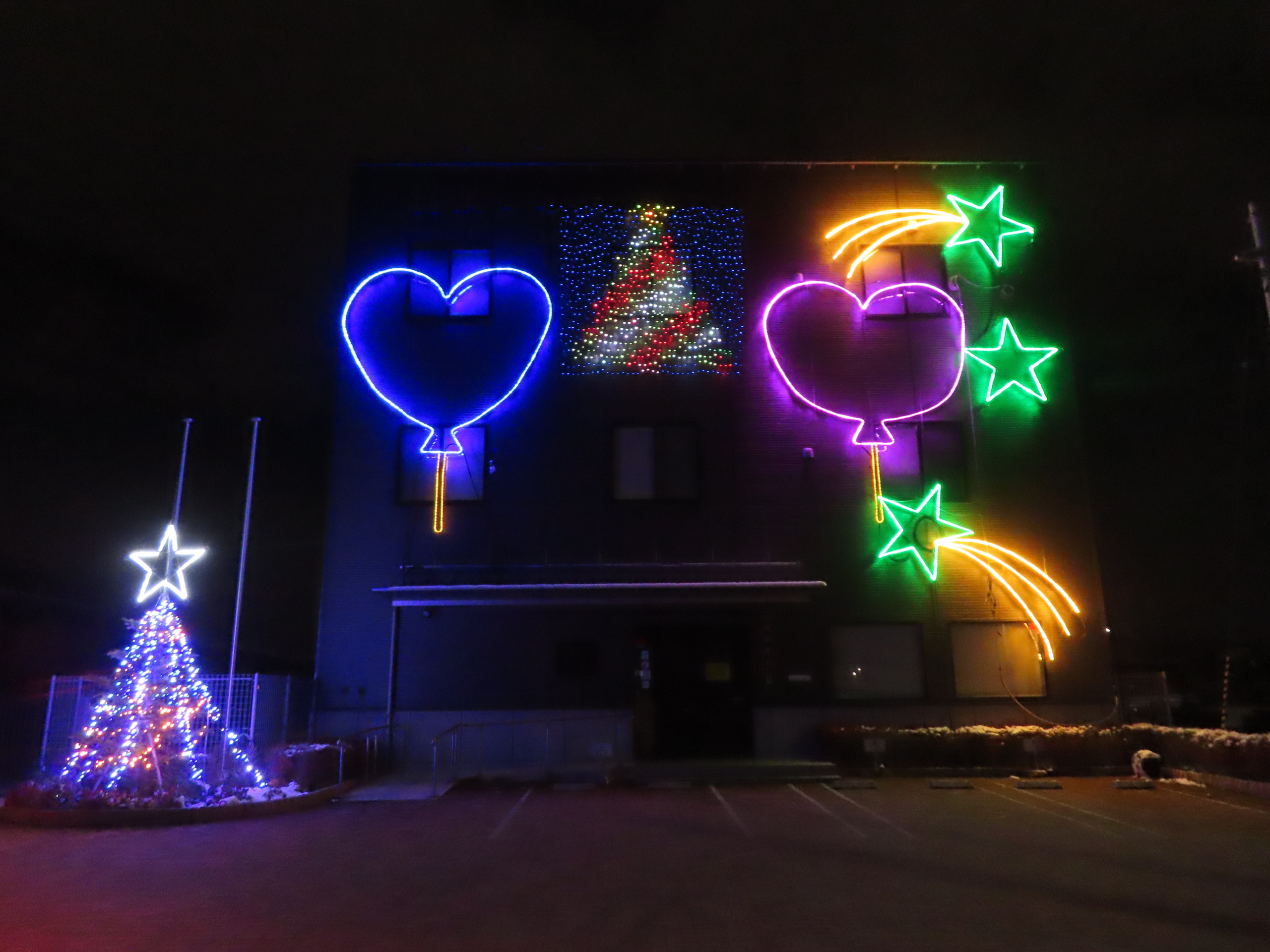 今年も社員が提案したデザインをもとに、社屋にイルミネーション装飾を施しました。